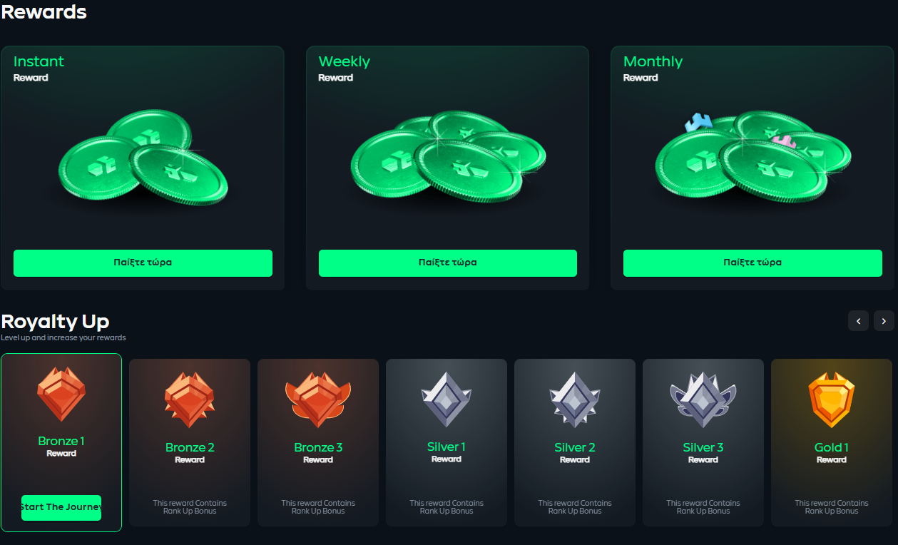 Επιστρέφει μικρό ποσοστό της δράσης, μειώνοντας το "καθαρό" κόστος σε βάθος χρόνου. Είναι χρήσιμο για τακτικά sessions και συχνά συνδέεται με επίπεδα VIP ή πόντους.Καθημερινές/Εβδομαδιαίες Ανταμοιβές